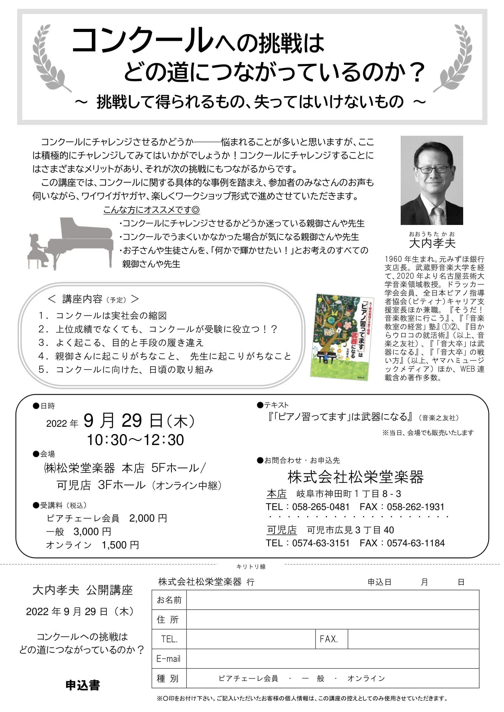 2022年9月29日(木)に本店5Fホール、可児店3Fホールにて、大内孝夫先生をお招きし、親御さんや指導者向けの公開講座「コンクールへの挑戦はどの道につながっているのか?~挑戦して得られるもの、失ってはいけないもの~」を開催しました。元メガバンク支店長の大内先生ならではの視点で、コンクールと受験の共通点や、コンクールに挑戦することで、これから先の人生にどう役立つのかをわかりやすくお話しいただきました。お話の中でも、「コンクールとアンサンブルは人生の縮図」という言葉がとても印象的で、コンクールでの理不尽な結果を受け入れることや、アンサンブル演奏で必要となるコミュニケーションや役割ごとの責任感は、社会に出た時にも必要となる力ということを教えて頂きました。