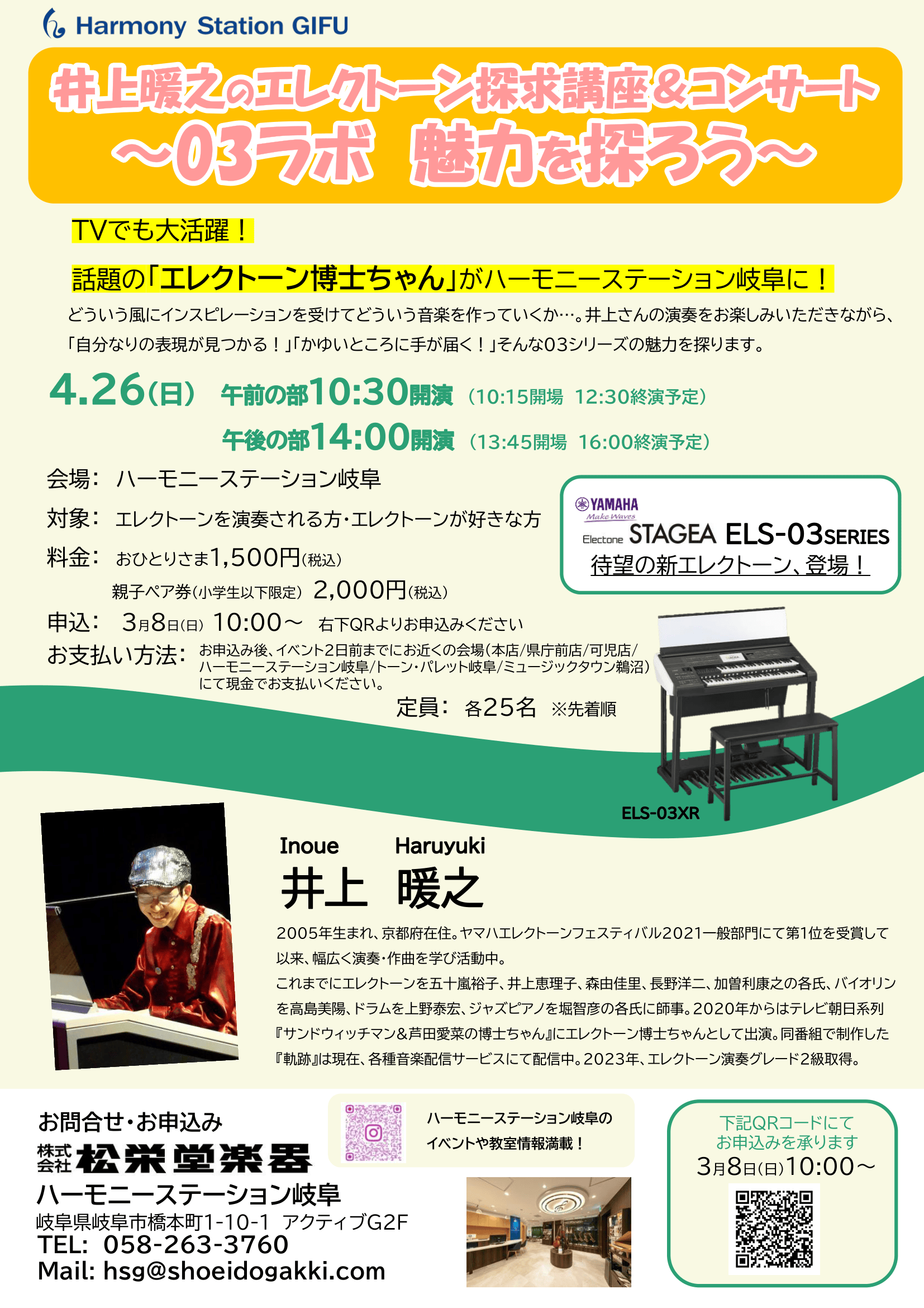 【4/26(日)】井上暖之のエレクトーン探求講座&コンサート【ハーモニーステーション岐阜】