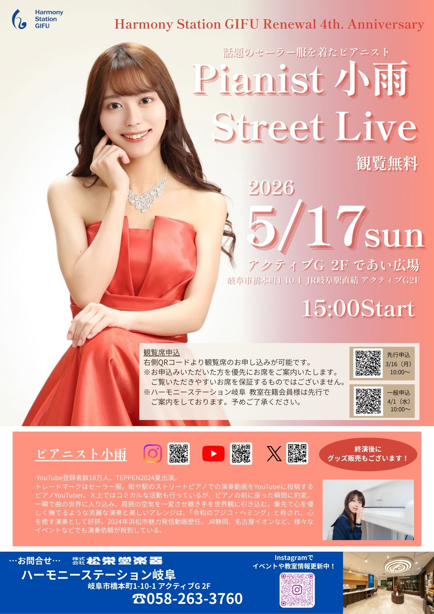 【5/17(日)】ピアニスト小雨 Street Live【ハーモニーステーション岐阜】